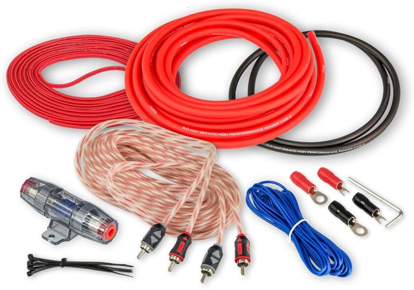 Комплект для подключения 2-х канального усилителя Силовой кабель 8AWG (8мм2) красный — 5 метров Проводник: CCA (омедненный алюминий) Силовой кабель 8AWG (8мм2) черный — 1 метр Проводник: CCA (омедненный алюминий) Колба MiniANL + предохранитель 40A RCA-кабель: 5 метров, 2 канала, витая пара (RCA-A150 MkII). Акустический кабель 16AWG (2×1,5мм2) — 10 метров Провод «remote» 18AWG (0,75мм2) синий — 5 метров Клемма кольцевая для силового кабеля сечением 8AWG (8мм2): 2 шт. Клемма U-образная для силового кабеля сечением 8AWG (8мм2): 2 шт. Шестигранник Стяжки - 10шт.