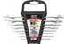 Рожковый гаечный ключ, он же гаечный с открытым зевом – это рукоятка с двумя рабочими краями, рабочая часть которых – U-образная подкова. Незаменимый универсальный инструмент для обслуживания крепежа, доступного лишь, с одной стороны. Крепеж надежно фиксируется в вилке и с помощью рычага происходит давление на откручивание или затягивание резьбового соединения. Инструменты изготавливаются из хромованадиевой стали по стандарту DIN 3110 и соответствуют требованиям ГОСТ 2838-80 и ГОСТ 10112-2001 по размерному ряду. Для вашего удобства мы собрали наиболее используемые размеры ключей в наборы. Прочный пластиковый держатель сделает хранение инструмента удобным и компактным. Размеры ключей: 6х7, 8х9, 8х10, 12х13, 14х15, 16x17, 17x19, 19х22 мм Покрытие: сатиновое ГОСТ 2838-80, ГОСТ 10112-2001 DIN-3118 Прочность: 47-52 HRC