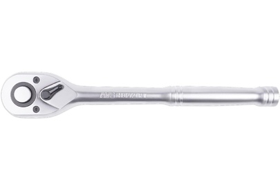 Рукоятка трещоточная с 72-зубцовым храповым механизмом и металлической рукояткой обеспечивает очень маленький 5° обратный ход благодаря конструкции храпового механизма. Предназначена для быстрого монтажа резьбовых соединений и при использовании в ограниченных рабочих пространствах. Посадочный размер: 1/2” DR Длина: 250 мм Материал – хромованадиевая сталь. Твердость – 45-48 HRC. Сатиновое покрытие.