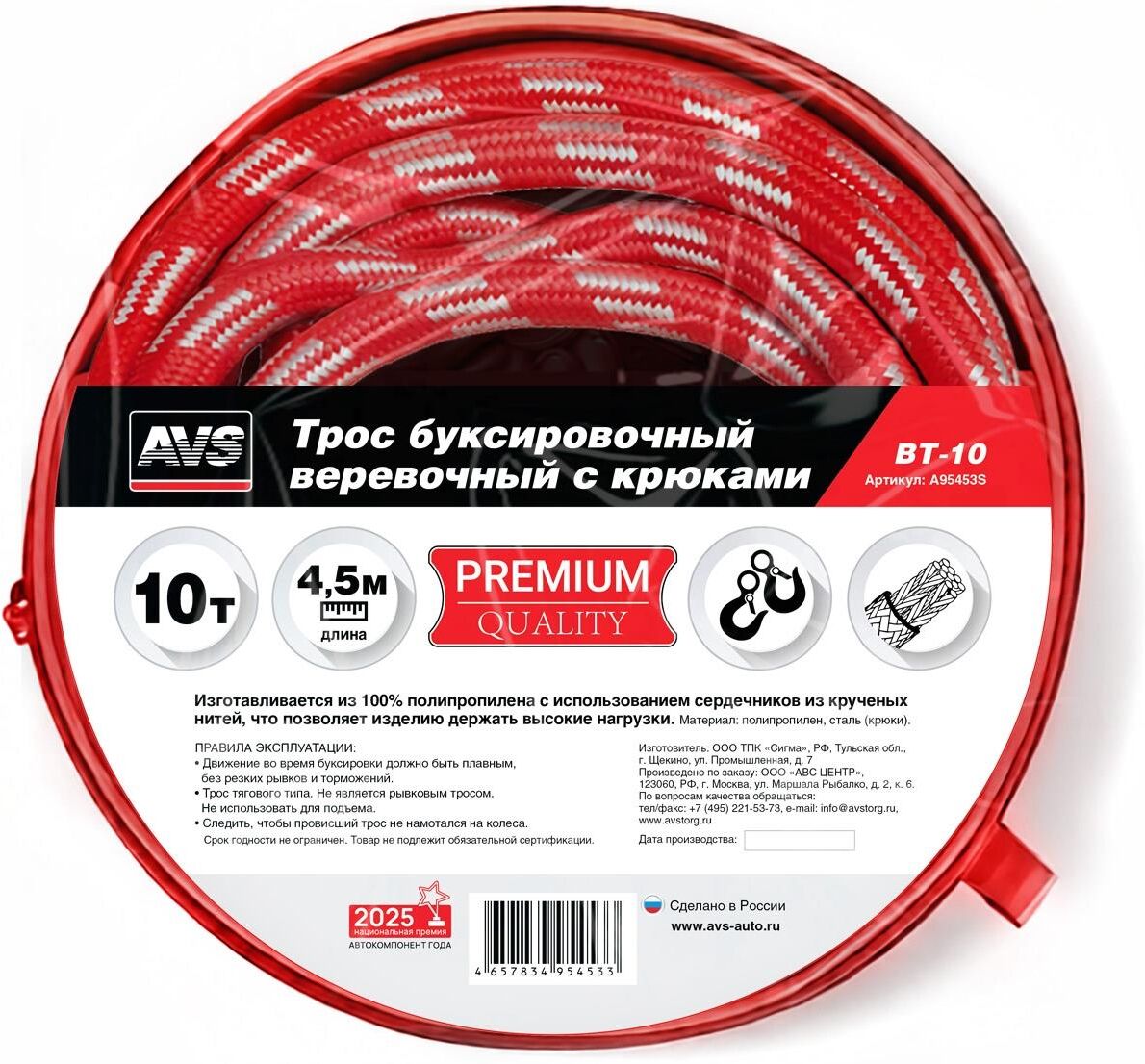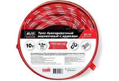 AVS Трос буксировочный веревочный с крюками 10т 4,5м BT-10 в сумке