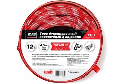 AVS Трос буксировочный веревочный с крюками 12т 4,5м BT-12 в сумке