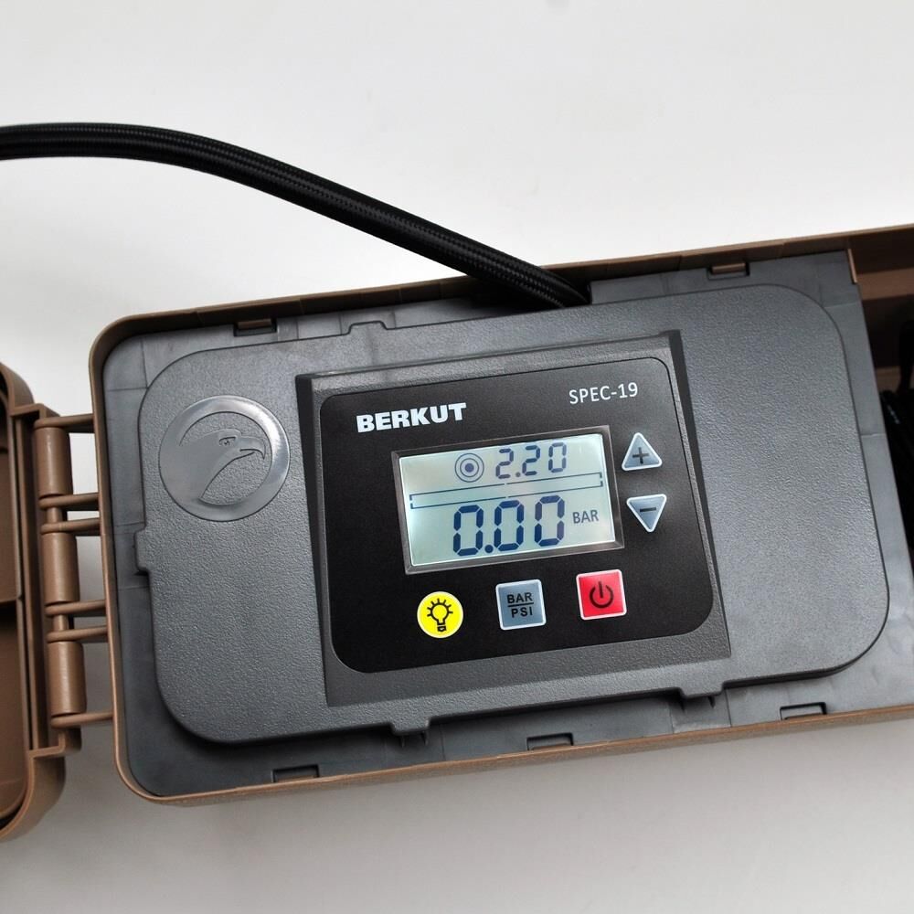 <p>BERKUT SPEC-19 – это современный автомобильный компрессор с повышенной производительностью и электронным управлением, который интегрирован в специальный пластиковый милитари-кейс.</p> <p>В этом компактном устройстве применяется новая двухпоршневая система работы и оборотистый электродвигатель с принудительным охлаждением.</p> <p>Компрессор оборудован цифровым манометром с подсветкой, который служит для контроля давления во время накачивания колес, а также для автоматического отключения компрессора при достижении заданного уровня давления.</p> <p>Автокомпрессор подключается к бортовой сети автомобиля через гнездо прикуривателя, а соединение с ниппелем шины производится за счет накручивающегося наконечника с кнопкой Deflator для стравливания избыточного давления.</p> <p>Отличным дополнением является встроенный мощный светодиодный фонарь, который подсвечивает область применения в темное время суток.</p> <p>Технические характеристики:&