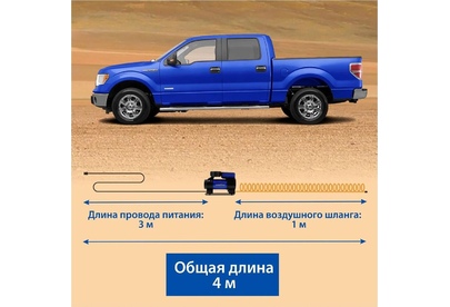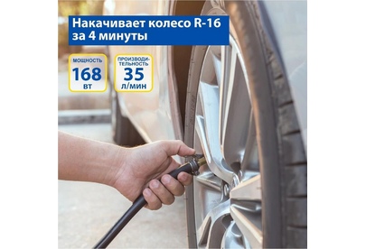 Мощность - 168 Вт, Производительность - 35 л/мин, Максимальное токопотребление - 14 А, Максимальное давление - 7 Атм, Длина провода питания: 3 м, Длина воздушного шланга: 1 м. Сумка и набор переходников в комплекте.