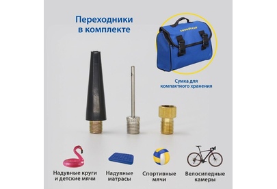 Производительность 35 л/мин, Давление до 7 атм, Для шин R13-R17, Питание 12 V, Защита флажковый предохранитель, Материал Сталь, Вес 1,9 кг, Воздушный компрессор Goodyear GY-35L LED 35 л/мин с фонарём, со съемной ручкой, сумка для хранения.