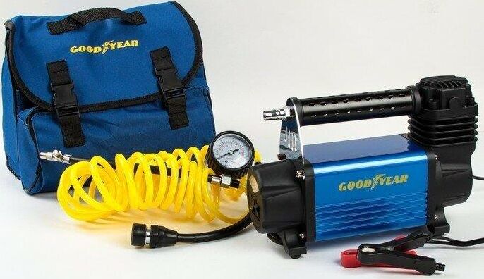 Воздушный компрессор Goodyear GY-50L LED 50 л/мин с фонарём, питание от АКБ, съемный витой шланг, сумка для хранения Воздушный компрессор Goodyear GY-50L LED 50 л/мин GY000113 с фонарем - незаменимый помощник в дороге для любого автолюбителя. Устройство применяется для накачивания автомобильных шин и колес OFF-ROAD техники, а также матрасов, лодок и мячей. Компрессор оснащен высокоточным манометром с погрешностью измерений до 5%. Питание устройства осуществляется напрямую через АКБ автомобиля. Технические характеристики Goodyear GY-50L LED GY000113 Напряжение, В 12 Тип двигателя электрический Производительность на входе, л/мин 50 Объем ресивера, л нет Транспортировочные колеса нет Частотный преобразователь нет Тип компрессора автокомпрессор Max давление, атм 10 Наличие фонаря да Защита от перегрева да