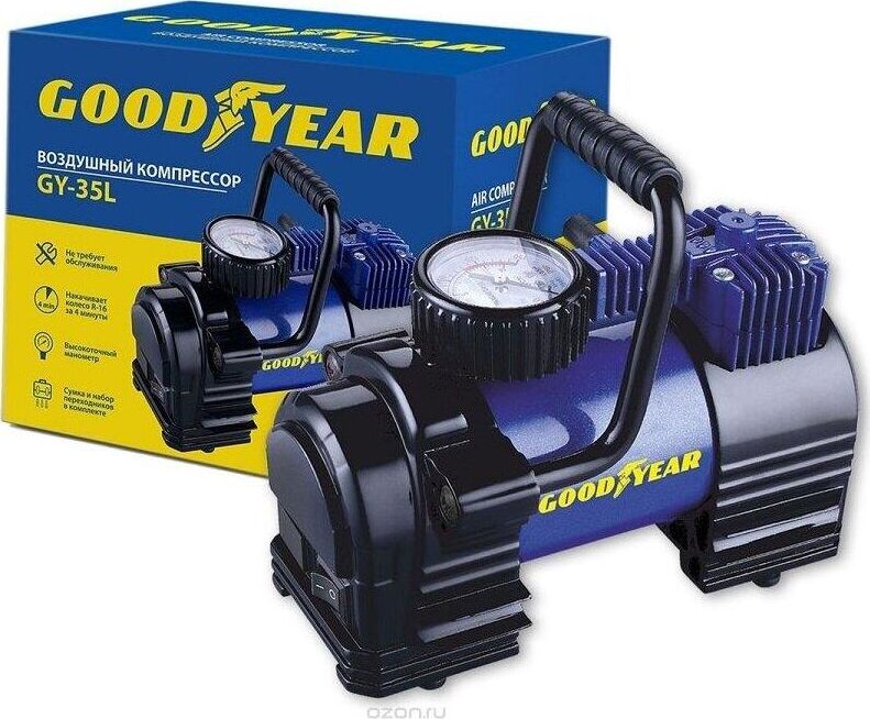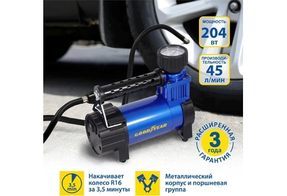 GOODYEAR GY000116 GY-45L CASE 45 л/мин Компрессор воздушный автомобильный Goodyear GY-45L/case с повышенной производительностью. Не требует обслуживания. Накачивает колесо R-16 за 3,5 минуты. Высокоточный манометр. Кейс и набор переходников в комплекте. Флажковый предохранитель в капсуле на контактном проводе. Металлический радиатор охлаждения камеры поршня. Расширенная гарантия (3 года). Оригинальный лицензированный продукт. Температура эксплуатации - -40..60°С. Время непрерывной работы - 30 минут.