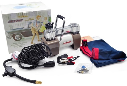 Допустимое напряжение: 10-13,5 В. Максимальный ток потребления: 14 А. Максимальное давление: 10 Атм. (кг/см2). Время непрерывной работы: 30 мин. Производительность: 57 л/мин. Рабочая температура: -40°С +70°С. Масса: 2,7 кг. Навинчивающаяся насадка на ниппель колеса. Подключение в прикуриватель. Спускной клапан – DEFLATOR. Универсальный шланг - удлинитель - 5.5 м. Встроенный плавкий предохранитель - 15A.