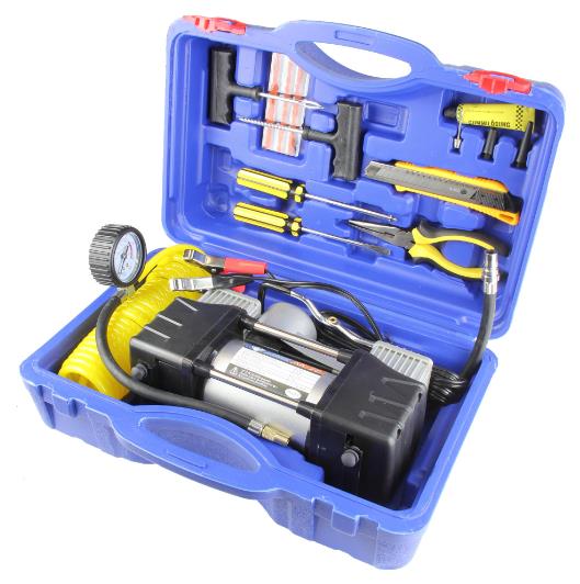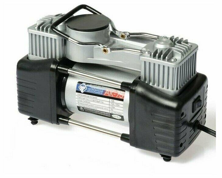 Мощность – 180 Вт. - Максимальная сила тока – 20 А. - Максимальное давление – до 10 кг/см? (150PSI/10Bar) - Производительность – до 75 л/мин. - Шнур питания – 2,7 м. - Воздушный шланг – 5м. - Пластиковый кейс для хранения и переноски - Подключение к клеммам АКБ при помощи металлических зажимов - Комплект насадок-переходников – 3 шт. -Набор дорожного инструмента Цвет- серебро Напряжение питания - 12В. Состав:металл, пластик