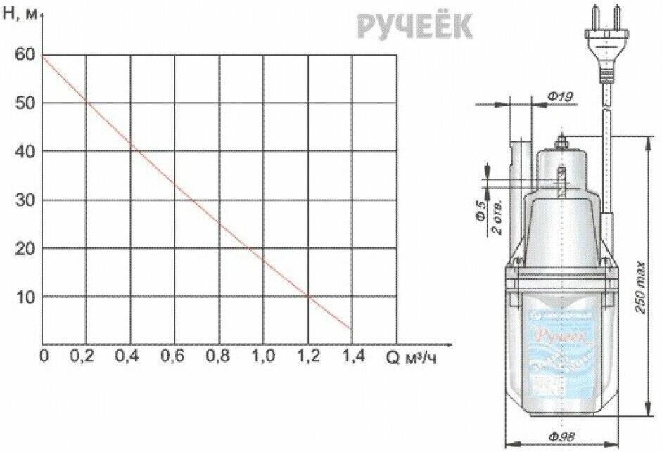 Может использоваться для полива огородов, садов, а также для бытового водоснабжения. Насос не имеют трущихся поверхностей и вращающихся деталей, что способствует длительной и безотказной работе. Насос «Ручеек-Техноприбор-1М» имеет термореле, предохраняющее его от сгорания и автоматически отключающее его при перегрузке. Полив огородов из насоса производится намагниченной водой, т. к. вода, проходя через электромагнитный привод намагничивается, что способствует повышению урожайности. Производительность насоса зависит от глубины скважины (колодца) и определяется по графику зависимости производительности насоса Q(л/мин) от напора H(м). Производительность, л/ч: с глубины 1 м, не менее 1050; с глубины 60 м, не менее 432; Мощность, Вт 225 Напряжение переменного тока, В 220 Высота подъема, м 60 Общий напор, атм. 4.0 Габаритные размеры (длина х диаметр), мм 280 х 100 Масса насоса (без провода), кг 3.6 Диаметр на выходе (в дюймах) 3/4