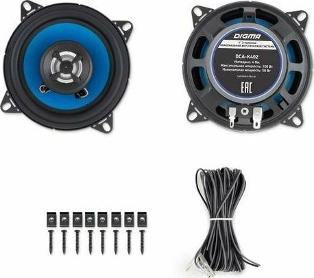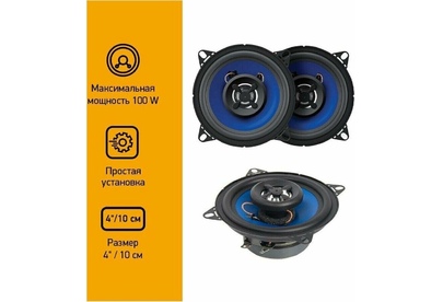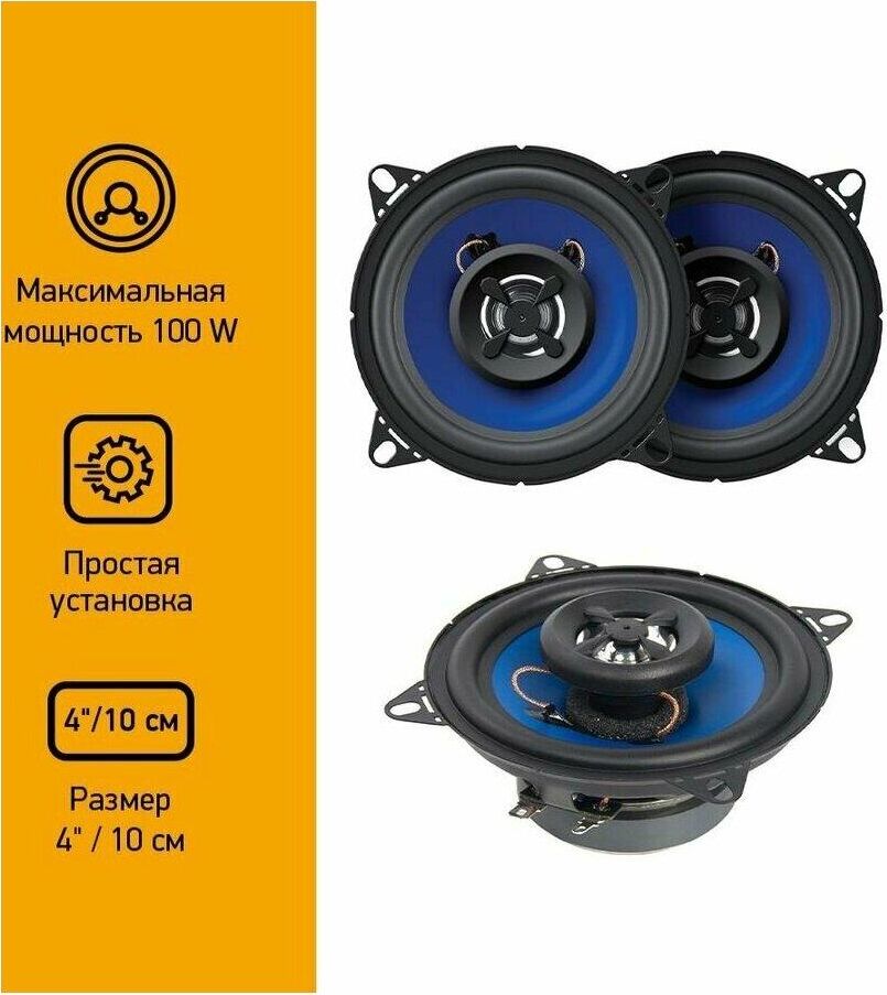 Коаксиальные двухполосные колонки автомобильные. Частотный диапазон 100гц-20кгц. Размер динамика 10 см (4 дюйм.). Номинальная мощность 50 Вт. Максимальная мощность 100 Вт. Чувствительность 90 дБ. Импеданс 4 Ом. Глубина установки 40 мм.