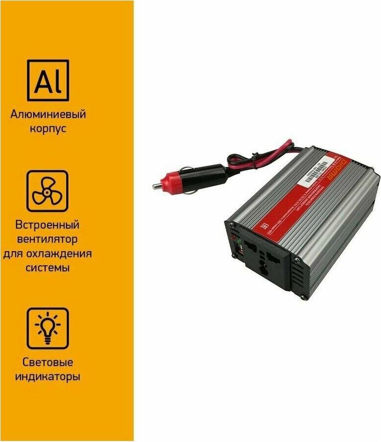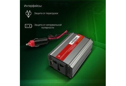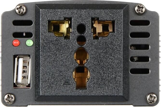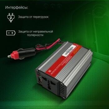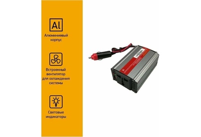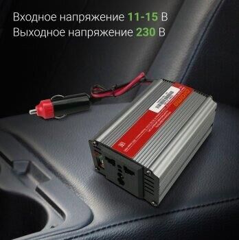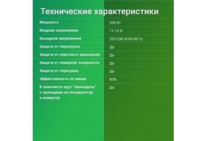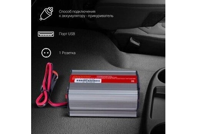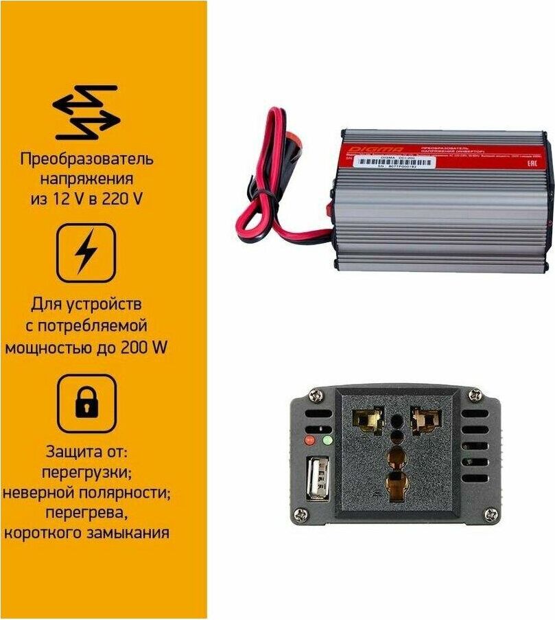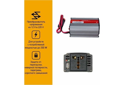 автомобильный преобразователь напряжения, входное напряжение: 11-15 В постоянного тока, выходное напряжение: 230 В переменного тока, выходная мощность БП: 200 Вт, USB