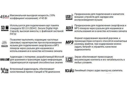 Радио. Рабочая частота: FM 87.5- 108 МГц. Количество ячеек памяти для сохранения настроенных радиостанций: 18. Промежуточная частота: 10,7 МГц. Чувствительность (30 дБ): 15 дБ. Отношение подавления помех от зеркального канала: 40 дБ. Соотношение сигнал/шум: 65 дБ. Частотная характеристика: 30 Гц-15 кГц. Проигрыватель медиафайлов. Файловая система: FAT16/FAT32. Объём флеш карты SD, USB: 32 Гб. Типы проигрываемых файлов: MP3/WMA/WAV. Отношение сигнал/шум: 85 дБ. Разделение стерео-каналов: 80 дБ. Частотная характеристика: 20Гц-20 кГц. Дополнительный вход AUX. Максимальное напряжение на входе: 1,0 В. Полное сопротивление на входе: 30 кОм. Частотная характеристика: 20 Гц-20 кГц. Разъём: мини Jack 3.5 мм. Остальное. Максимальная выходная мощность (10% коэффициент искажения): 4*45 Вт. Регулировка тембра: ±8дБ (низкие частоты 100Гц, высокие частоты 10 кГц). Импеданс динамика: 4-8 Ом/канал. RCA стерео аудиовыход. Напряжение питания: постоянный ток +11,8 – 14,4 B (на корпусе «–»). Максимальный потребляемый ток: 5 А.