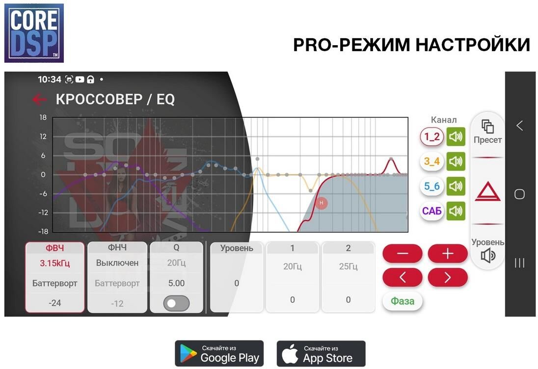 Автомобильный процессорный BT/USB/FM ресивер Мощный встроенный усилитель D-класса. Максимальная выходная мощность: 6×141Вт Номинальная выходная мощность (при КНИ менее 1%): 6×71Вт Минимальное сопротивление динамиков: 4 Ома USB-разъём с током зарядки: до 1.2А Чтение звуковых форматов: Hi-res FLAC (24 bit/48kHz), MP3, WAV, APE, AAC RCA-выходы: 4 пары (8 каналов) Максимальная амплитуда выходного сигнала RCA: до 6 вольт ПЛАТФОРМА: CORE-DSP PRO-режим настройки Поканальная временная коррекция звукового поля (Time Alignment) 48-полосный параметрический эквалайзер Регулировка добротности (Q-factor) для каждой из полос 8-полосный кроссовер: 1-6 каналы: HPF (ФВЧ) / LPF (ФНЧ): 20 Гц — 12,5 кГц / Отключен 7-8 каналы: HPF (ФВЧ) / LPF (ФНЧ): 10 Гц — 800 Гц / Отключен Крутизна спада: до 48дБ на октаву Выбор типа фильтра: Баттерворт, Линквиц-Райли, Бессель. Стерео-режим для 7-8 каналов Bluetooth 5.3Совместимое с iOS и Android приложение RGB-подсветка передней панели (3 зоны, 16 млн. цветов)