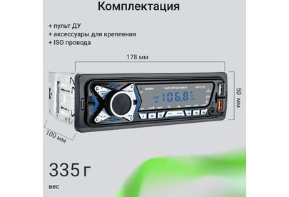 ипоразмер 1 din Максимальная мощность 2 х 45 Вт Цвет подсветки голубой Эквалайзер есть Аудиовход на передней панели есть Поддержка носителей CD-проигрыватель Нет DVD-проигрыватель Нет USB-порт 2 Основной тип карт памяти SD/MMC Bluetooth Версия Bluetooth v5.0 Дополнительно в комплекте Пульт дистанционного управления есть Упаковка Габариты упаковки (ед) ДхШхВ 0.205x0.16x0.08 м Вес упаковки (ед) 0.515 кг