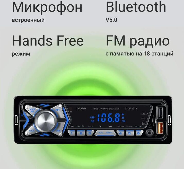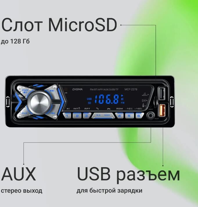 Автомагнитола DIGMA MCP-227B 1DIN 2x45Вт BT5.0 USB2.0 AUX 2 ПДУ