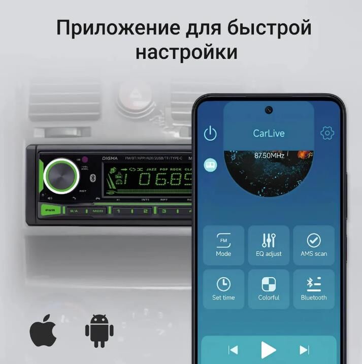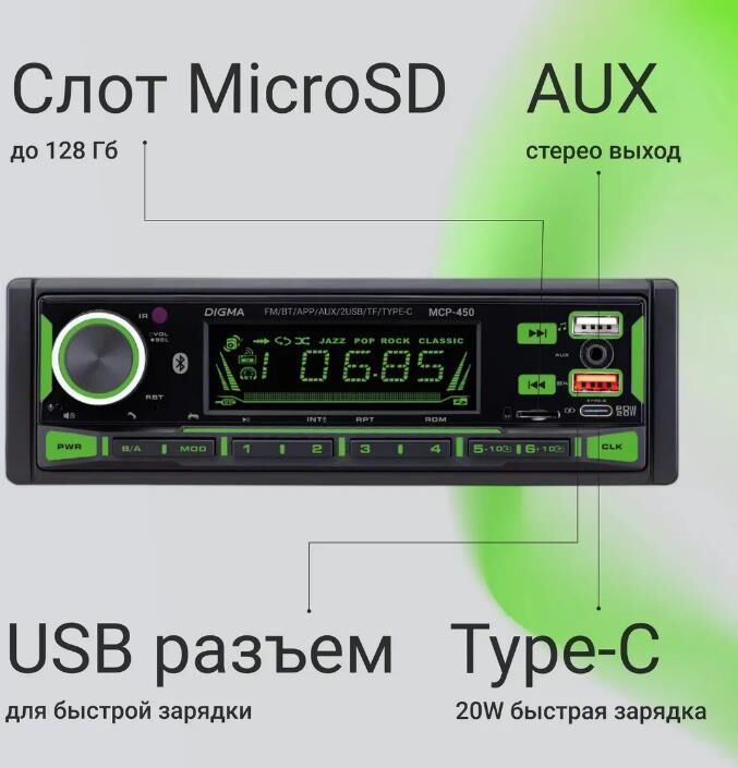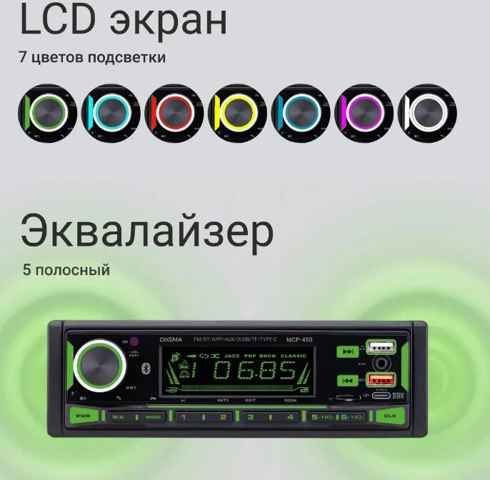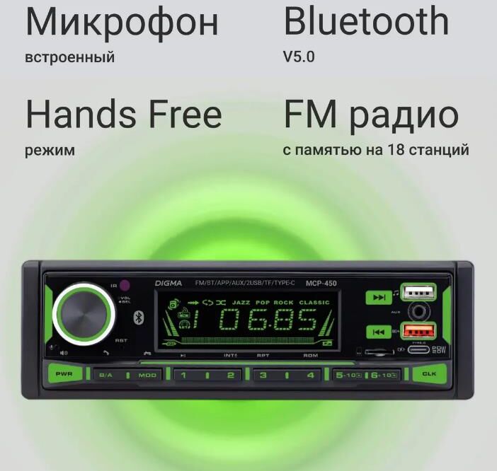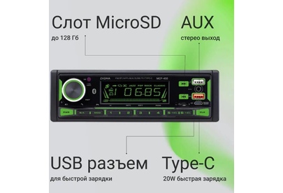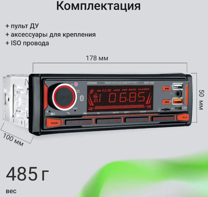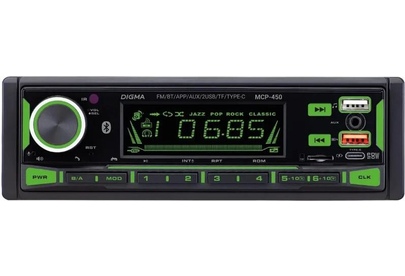 Автомагнитола DIGMA MCP-450 1DIN 4x45Вт BT5.0 USB2.0 AUX 4 ПДУ