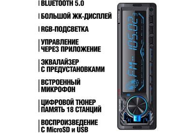 Аудиовход AUX на передней панели Bluetooth + (аудио, handsfree) USB порт + Дисплей монохромный ЖК Поддержка карт памяти TF card/micro SD Максимальная выходная мощность 4 х 45 Вт Цвет черный DSP-процессор Classic, Pop, Rock, Flat ISO-разъем Воспроизведение потокового аудиосигнала (A2DP) Воспроизведение форматов MP3 Линейный RCA-выход 2 Микрофон встроенный Передняя панель фиксированная Питание Подсветка кнопок Изменяемая RGB подсветка, 7 цветов Пульт дистанционного управления Приложение для Android