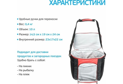 Благодаря высококачественным внутренним элементам термосумка AVS способна поддерживать температуру помещенных в нее продуктов в среднем до 12 часов. Снаружи сумка выполнена из плотной износостойкой ткани, внутри имеет термоизоляционную прокладку и вспененный полиуретан, способный "отражать" холодный воздух. Также данная термосумка защищена изнутри водонепроницаемой и экологически чистой пленкой Peva, которая не содержит тяжелых металлов и состоит из растительного сырья. Это обеспечивает определенную безопасность для ваших продуктов и для окружающей среды в целом. Сумка имеет вместительное внутреннее отделение, закрывающееся на молнию, а снаружи - два сетчатых боковых кармана и один передний карман на молнии. Для удобства переноски предусмотрен регулируемый плечевой ремень. Характеристики •Объем: 20 л •Размер: 31,5*22*33 см •Внутренний размер: 29*20*30 см •Вес: 0,61 кг Материал: полиэстер, полиуретан, PEVA Состав: Полиэстер, полиуретан, PEVA
