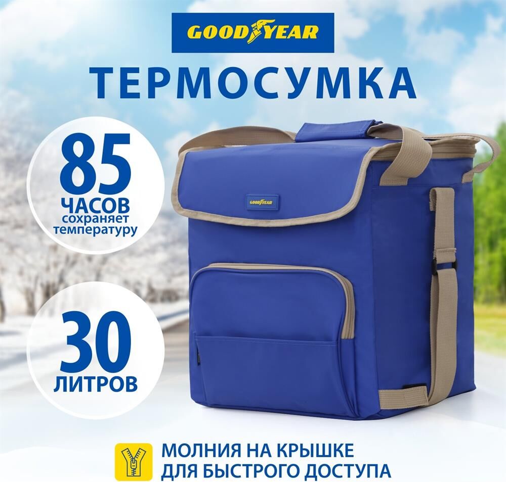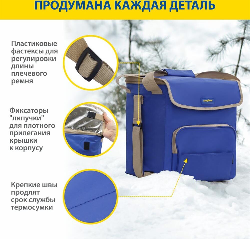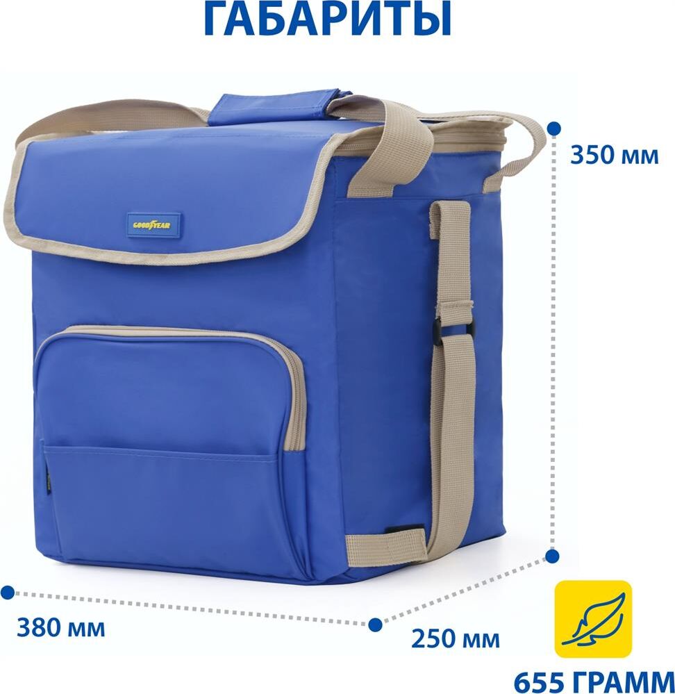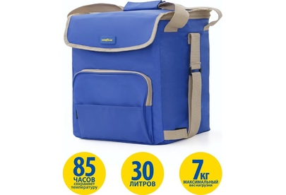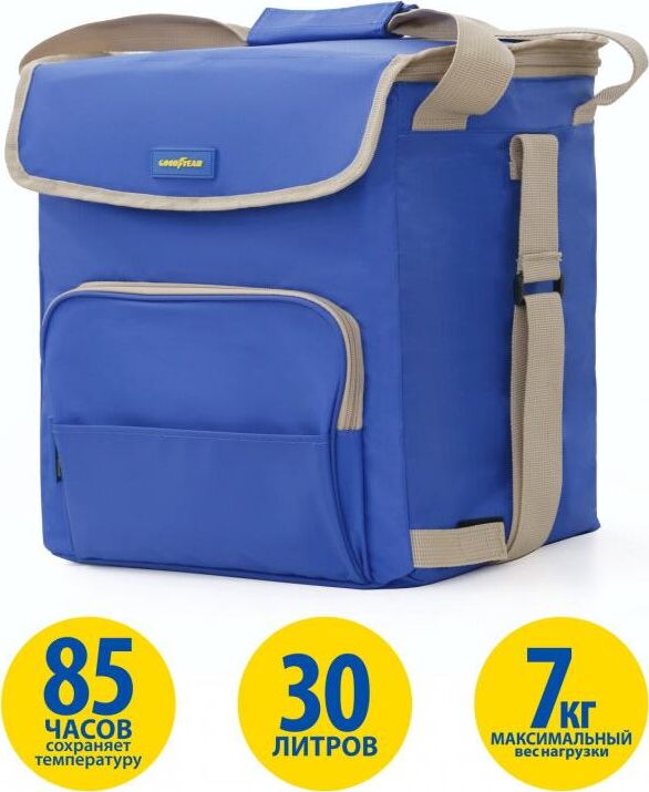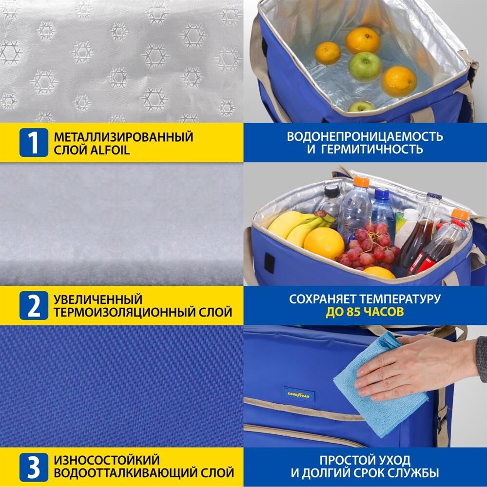 Объем 30 литров Габариты 380 х 350 х 250 мм Вес 0,65 кг Вес нагрузки 7 кг ОПИСАНИЕ ТЕХНИЧЕСКИЕ ХАРАКТЕРИСТИКИ ПРЕИМУЩЕСТВА Термосумка Goodyear поддерживает определенную температуру внутри и сохраняет свежесть продуктов в течение долгого времени. Это незаменимый помощник при транспортировке продуктов, выездов на пикник и в путешествия, для рыбалки и туризма. Термосумка поддерживает тепло или холод до 85 часов. Она сохранит свежесть и качество охлажденного или замороженного мяса, рыбы, морепродуктов, а также овощей, фруктов, прохладительных напитков и медикаментов. Кроме того, сумка-холодильник идеально подходит для поддержания температуры готовых горячих блюд и детского питания. Внутренний металлизированный слой AlFoil делает отсек для хранения герметичным и защищает сумку от протекания. Материал не впитывает запахи и его просто поддерживать в чистоте. С наружной стороны сумка-холодильник выполнена из плотной износостойкой ткани, которая не промокает и легко моется.