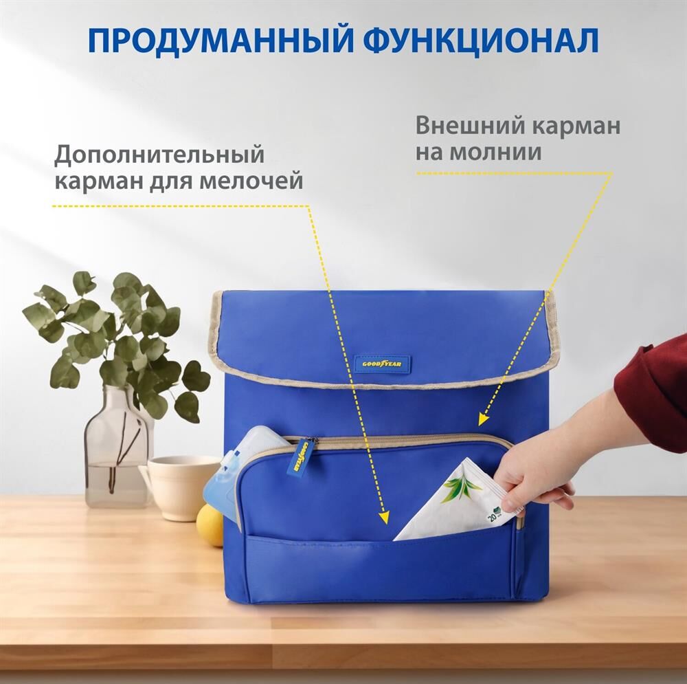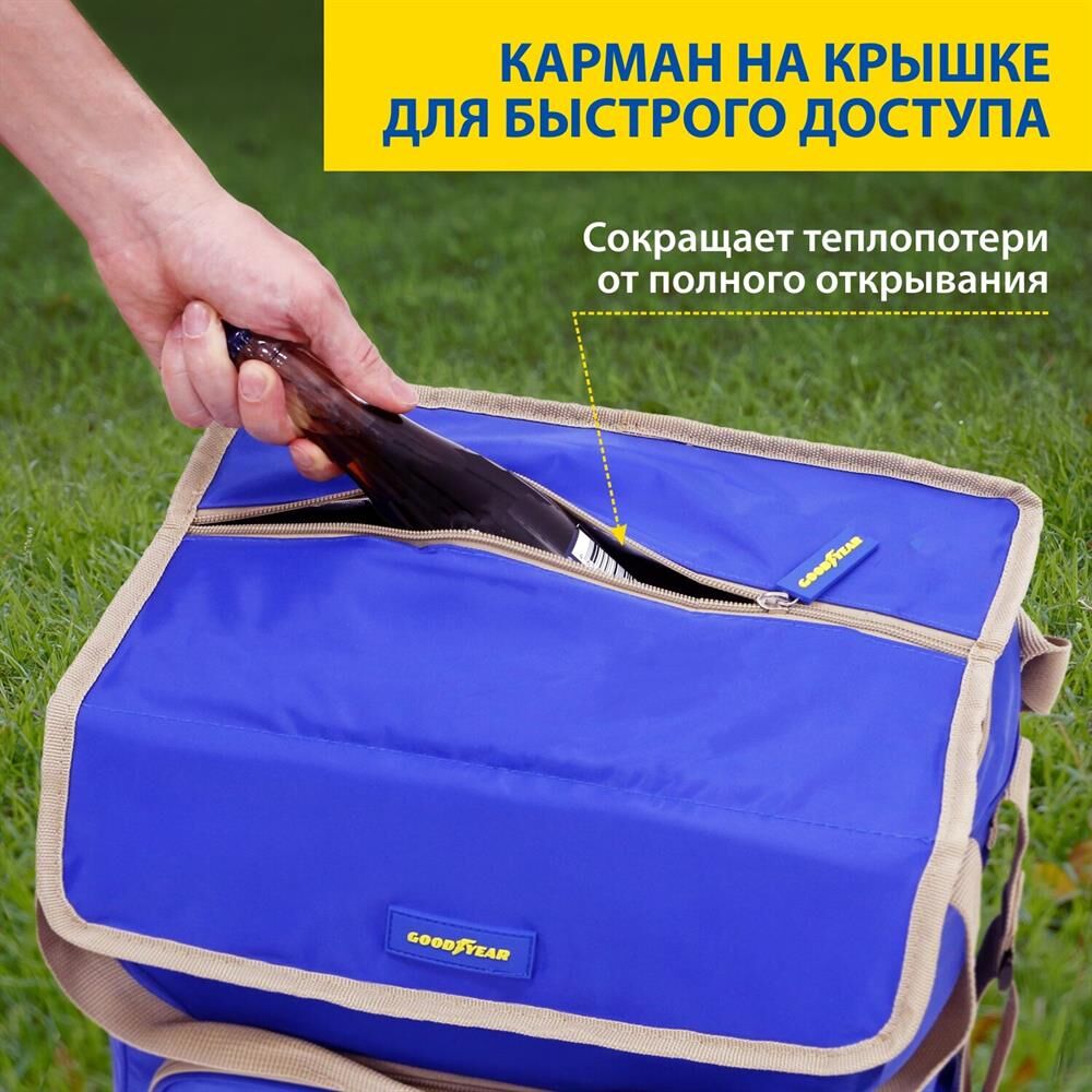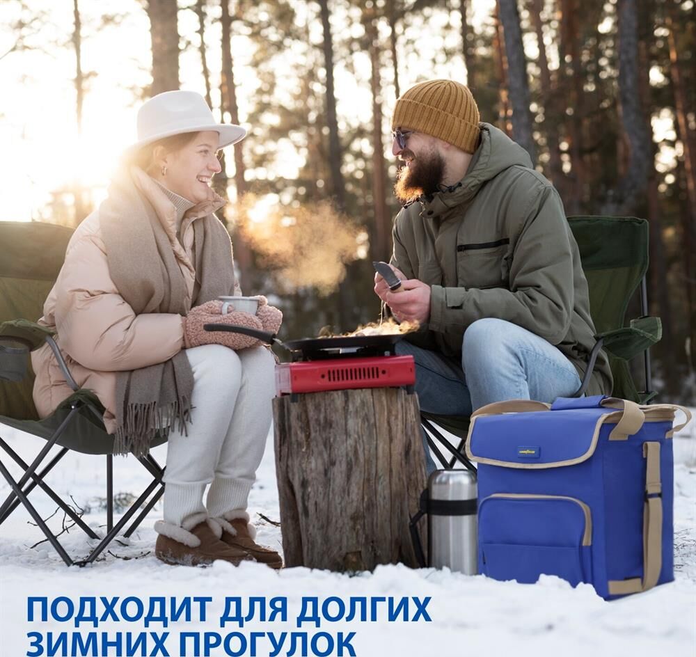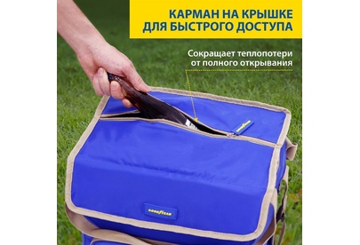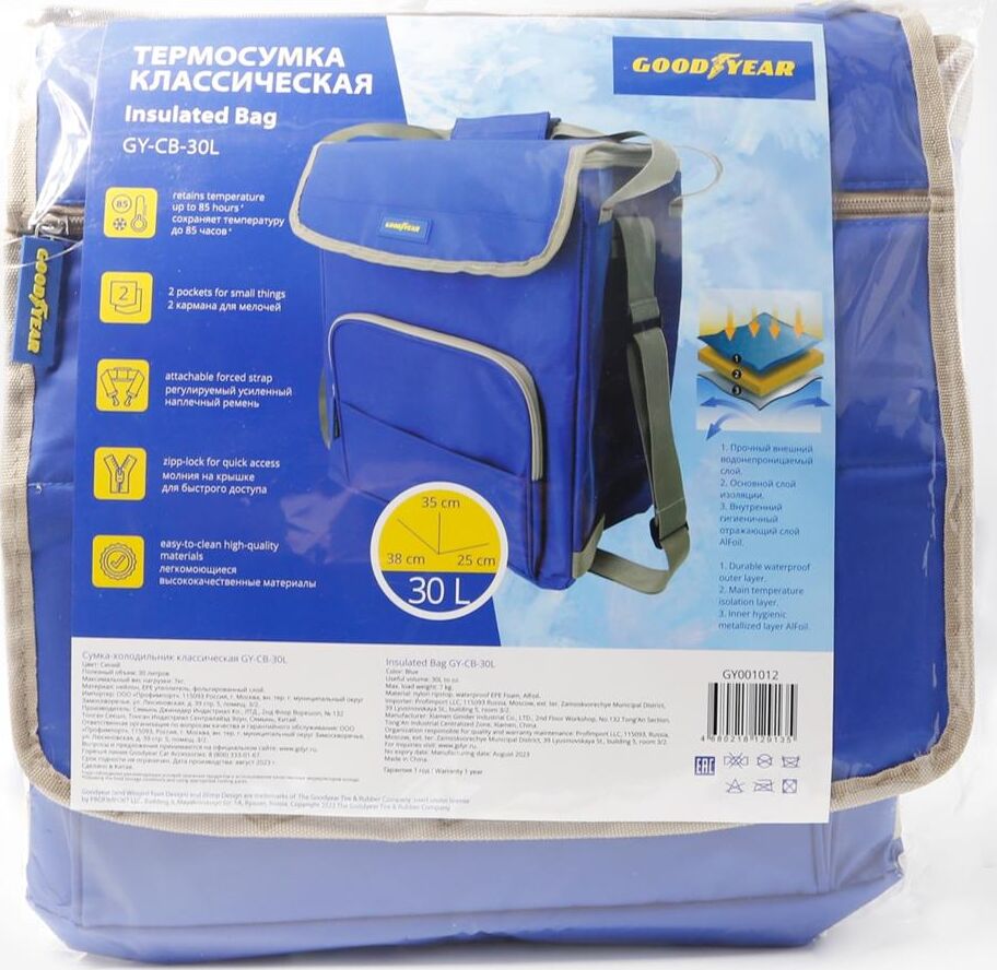 Объем 30 литров Габариты 380 х 350 х 250 мм Вес 0,65 кг Вес нагрузки 7 кг ОПИСАНИЕ ТЕХНИЧЕСКИЕ ХАРАКТЕРИСТИКИ ПРЕИМУЩЕСТВА Термосумка Goodyear поддерживает определенную температуру внутри и сохраняет свежесть продуктов в течение долгого времени. Это незаменимый помощник при транспортировке продуктов, выездов на пикник и в путешествия, для рыбалки и туризма. Термосумка поддерживает тепло или холод до 85 часов. Она сохранит свежесть и качество охлажденного или замороженного мяса, рыбы, морепродуктов, а также овощей, фруктов, прохладительных напитков и медикаментов. Кроме того, сумка-холодильник идеально подходит для поддержания температуры готовых горячих блюд и детского питания. Внутренний металлизированный слой AlFoil делает отсек для хранения герметичным и защищает сумку от протекания. Материал не впитывает запахи и его просто поддерживать в чистоте. С наружной стороны сумка-холодильник выполнена из плотной износостойкой ткани, которая не промокает и легко моется.