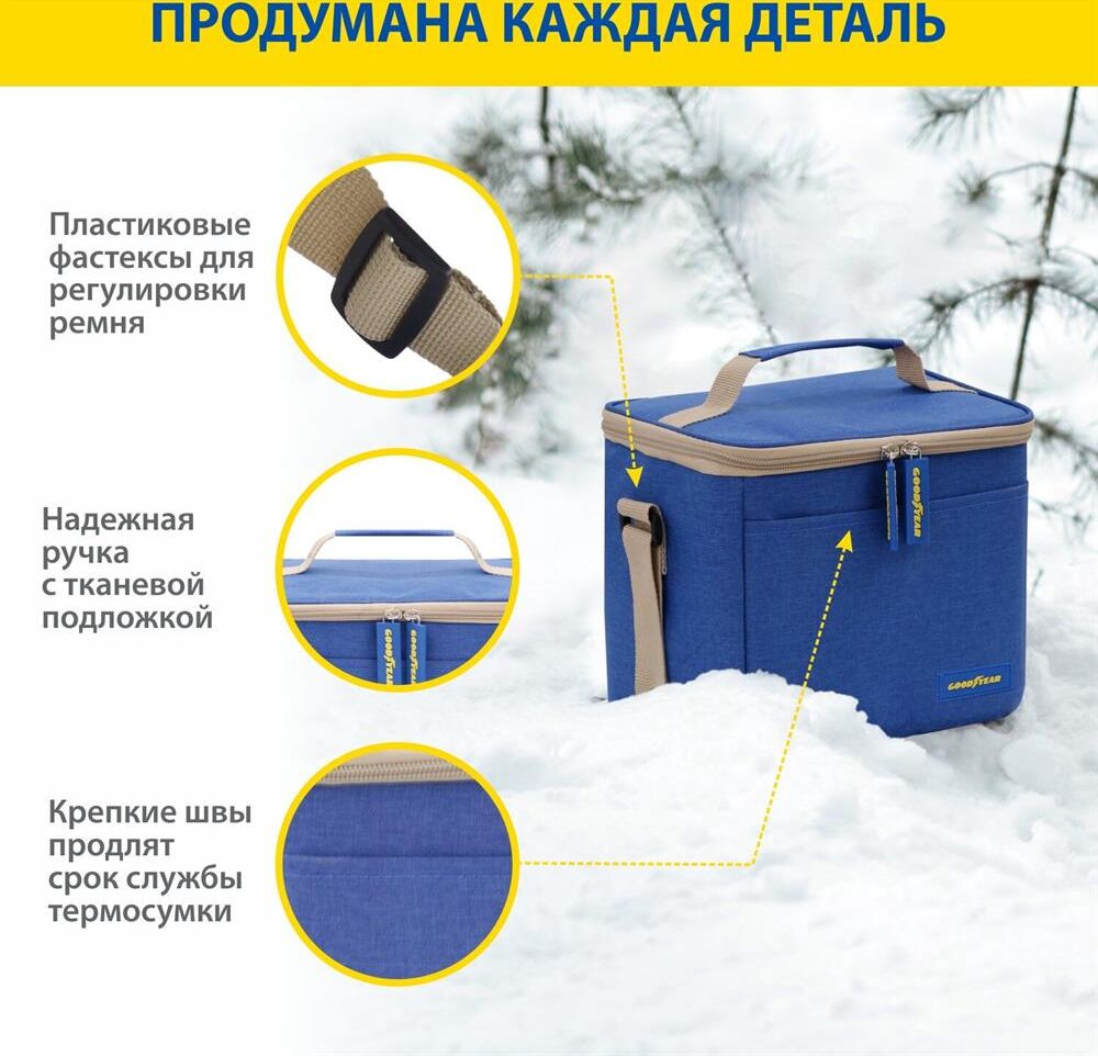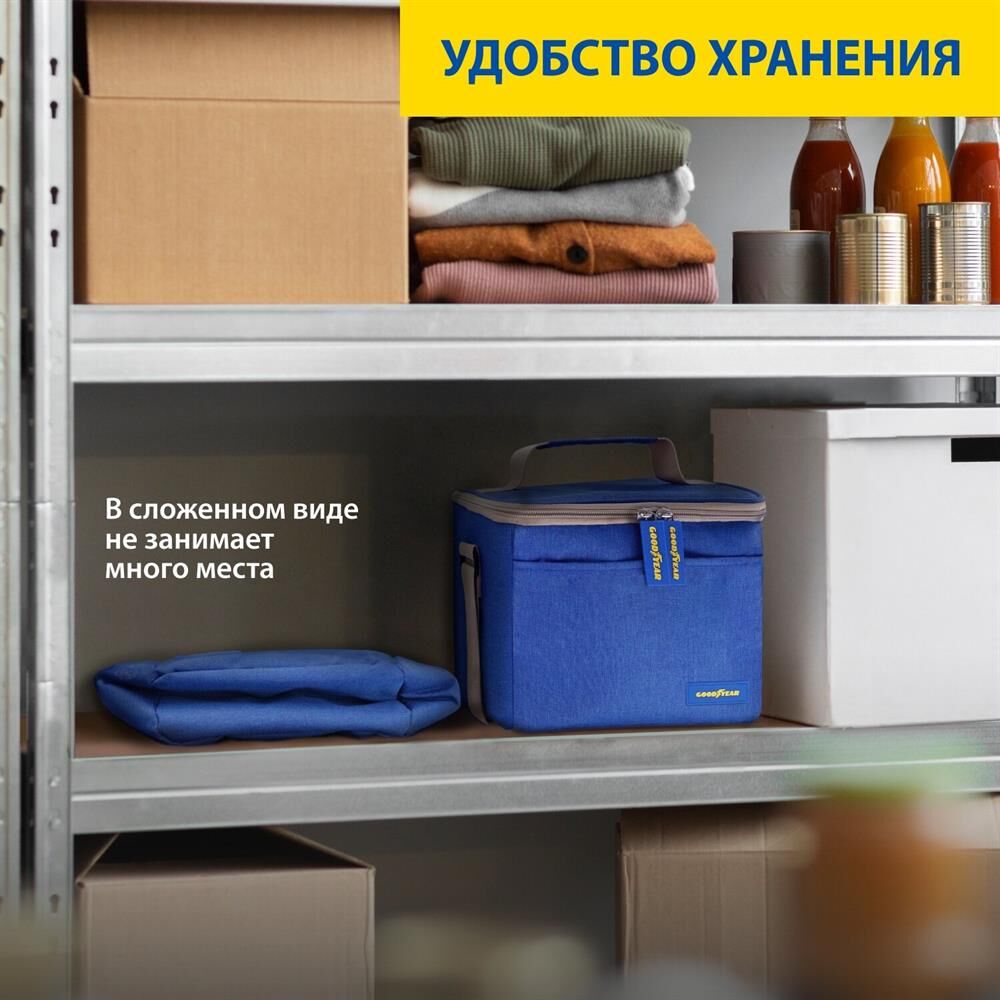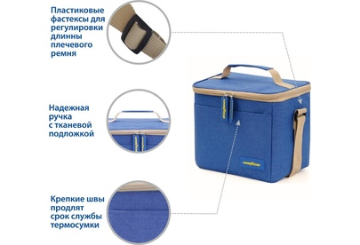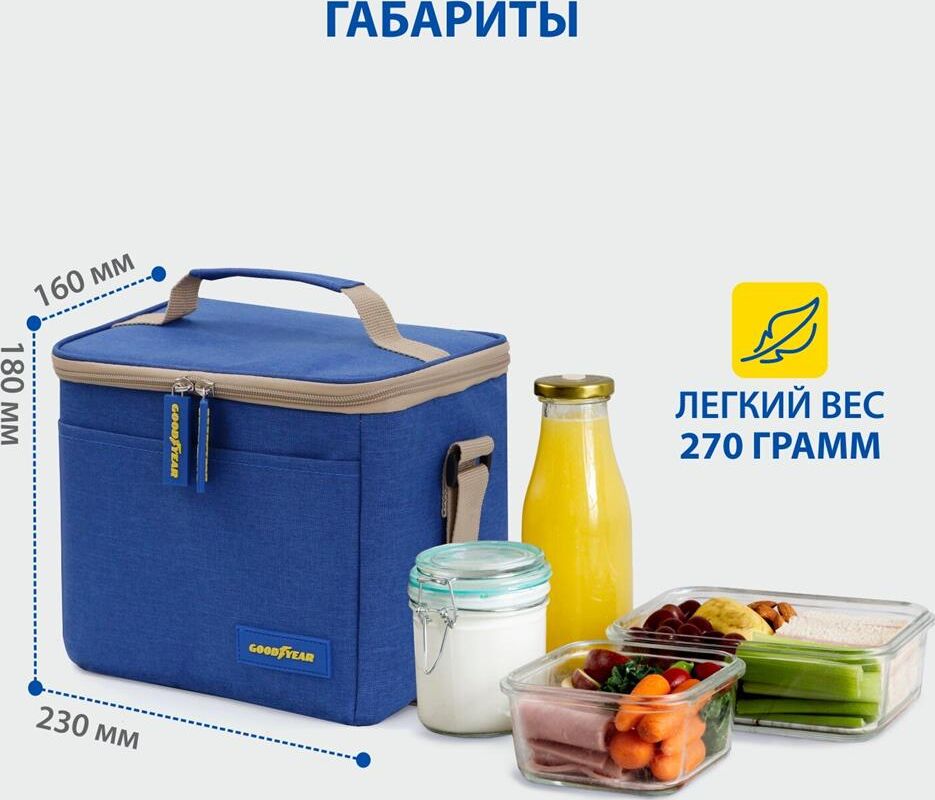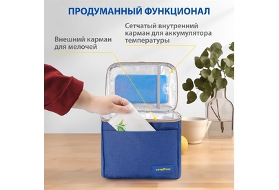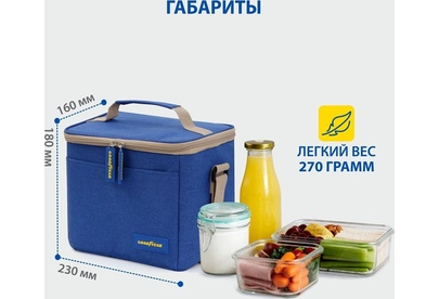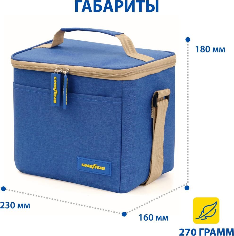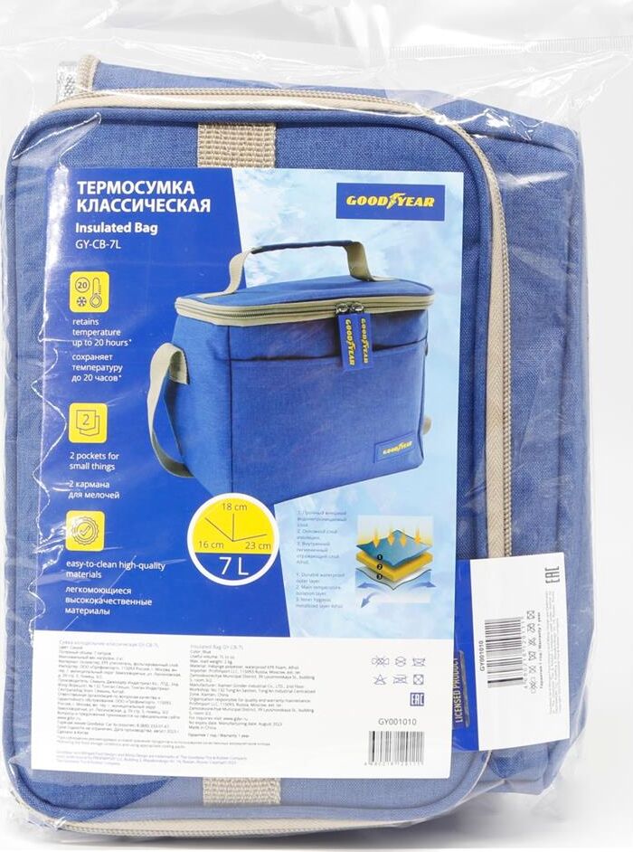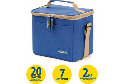Объем 7 литров Габариты 160 х 180 х 230 мм Вес 0,27 кг Вес нагрузки 2 кг. ОПИСАНИЕ ТЕХНИЧЕСКИЕ ХАРАКТЕРИСТИКИ ПРЕИМУЩЕСТВА Термосумка Goodyear поддерживает определенную температуру внутри и сохраняет свежесть продуктов в течение долгого времени. Это незаменимый помощник при транспортировке продуктов, выездов на пикник и в путешествия, для рыбалки и туризма. Термосумка поддерживает тепло или холод до 20 часов. Она сохранит свежесть и качество охлажденного или замороженного мяса, рыбы, морепродуктов, а также овощей, фруктов, прохладительных напитков и медикаментов. Кроме того, сумка-холодильник идеально подходит для поддержания температуры готовых горячих блюд и детского питания. Внутренний металлизированный слой AlFoil делает отсек для хранения герметичным и защищает сумку от протекания. Материал не впитывает запахи и его просто поддерживать в чистоте. С наружной стороны сумка-холодильник выполнена из плотной износостойкой ткани, которая не промокает и легко моется.