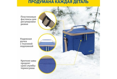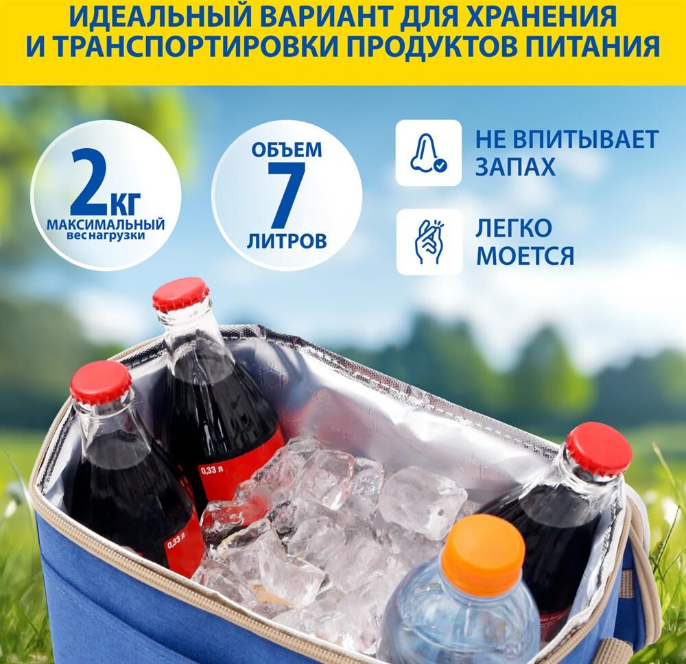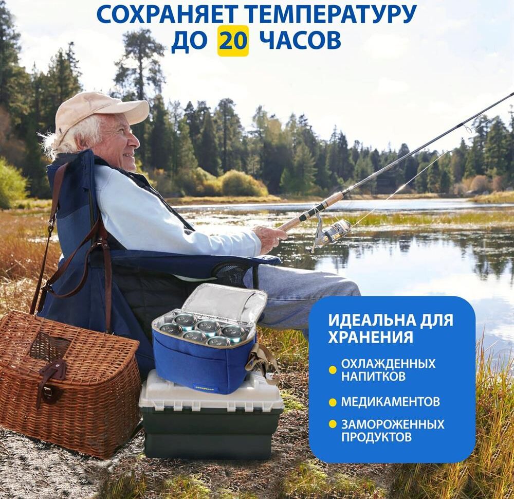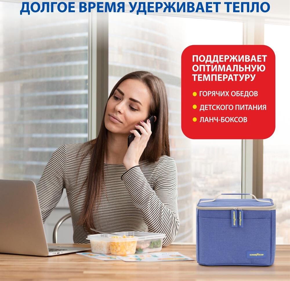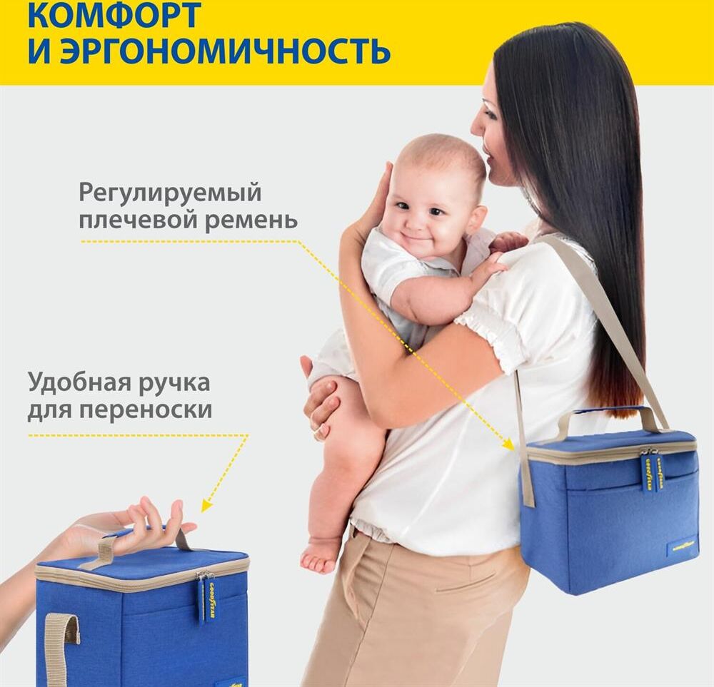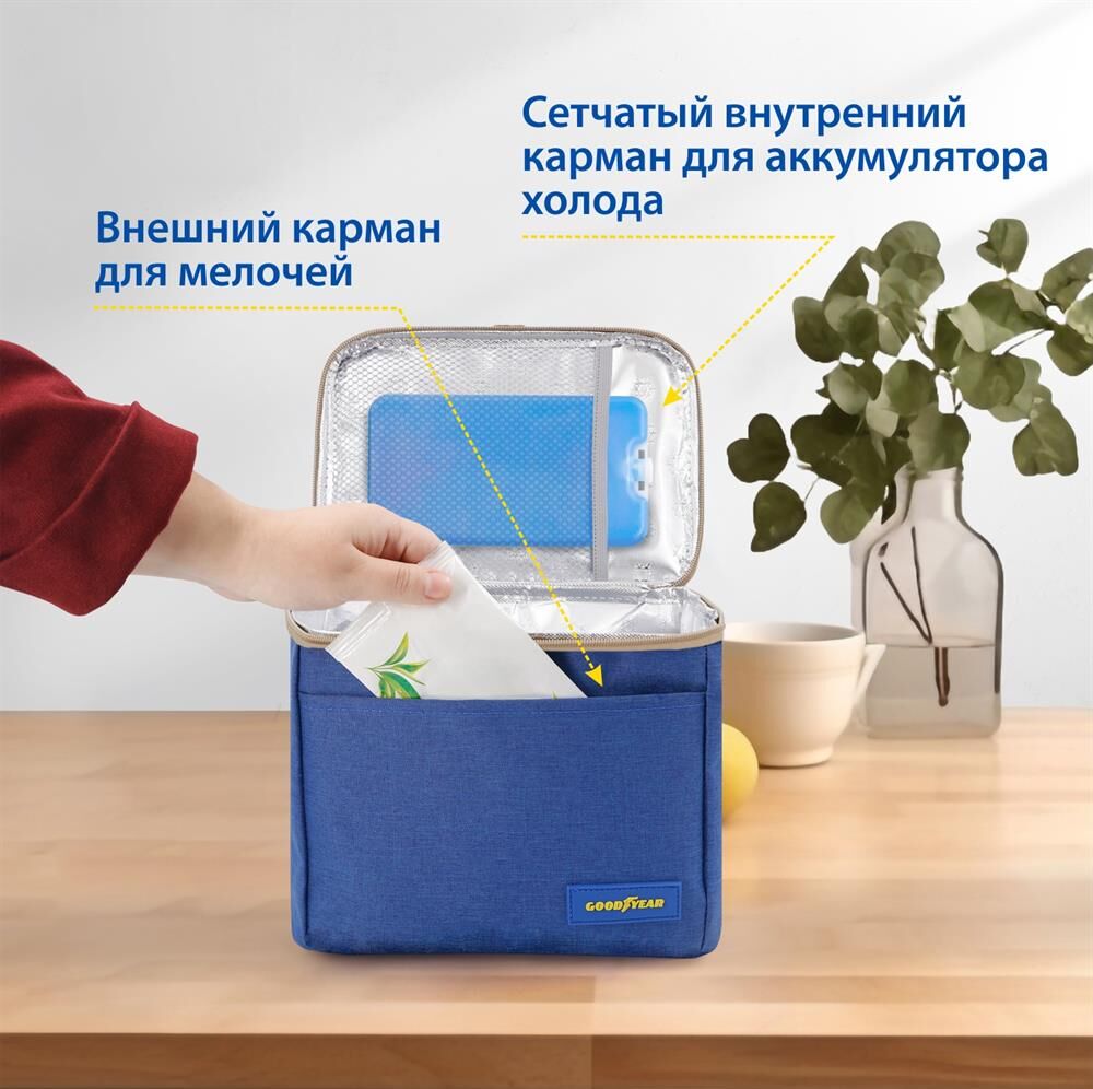 Объем 7 литров Габариты 160 х 180 х 230 мм Вес 0,27 кг Вес нагрузки 2 кг. ОПИСАНИЕ ТЕХНИЧЕСКИЕ ХАРАКТЕРИСТИКИ ПРЕИМУЩЕСТВА Термосумка Goodyear поддерживает определенную температуру внутри и сохраняет свежесть продуктов в течение долгого времени. Это незаменимый помощник при транспортировке продуктов, выездов на пикник и в путешествия, для рыбалки и туризма. Термосумка поддерживает тепло или холод до 20 часов. Она сохранит свежесть и качество охлажденного или замороженного мяса, рыбы, морепродуктов, а также овощей, фруктов, прохладительных напитков и медикаментов. Кроме того, сумка-холодильник идеально подходит для поддержания температуры готовых горячих блюд и детского питания. Внутренний металлизированный слой AlFoil делает отсек для хранения герметичным и защищает сумку от протекания. Материал не впитывает запахи и его просто поддерживать в чистоте. С наружной стороны сумка-холодильник выполнена из плотной износостойкой ткани, которая не промокает и легко моется.