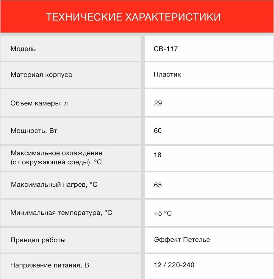 Объем камеры 29 л Потребляемая мощность 48 Вт Охлаждение, до 18 °С температуры окружающей среды Функция нагрев ДА Нагрев, до 65 °С Питание от бортовой сети автомобиля 12В Питание от бытовой электросети 220/240В Устройство для транспортирования ручка для переноски Материал корпуса пластик Цвет синий и серый Размеры 405 x 502 x 305 мм
