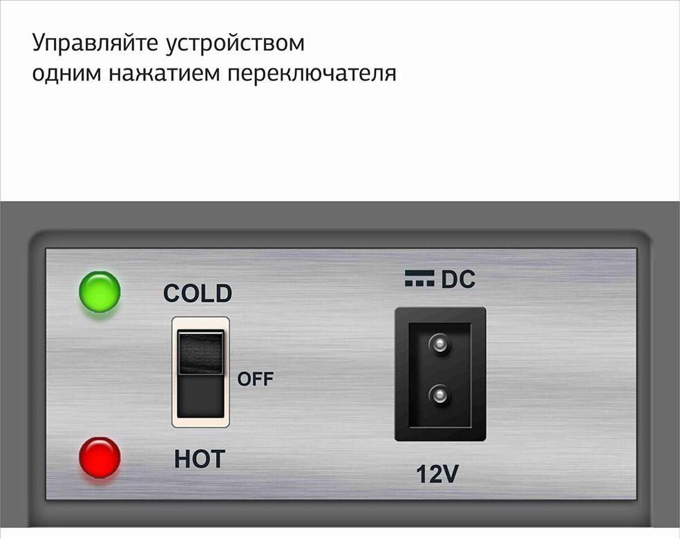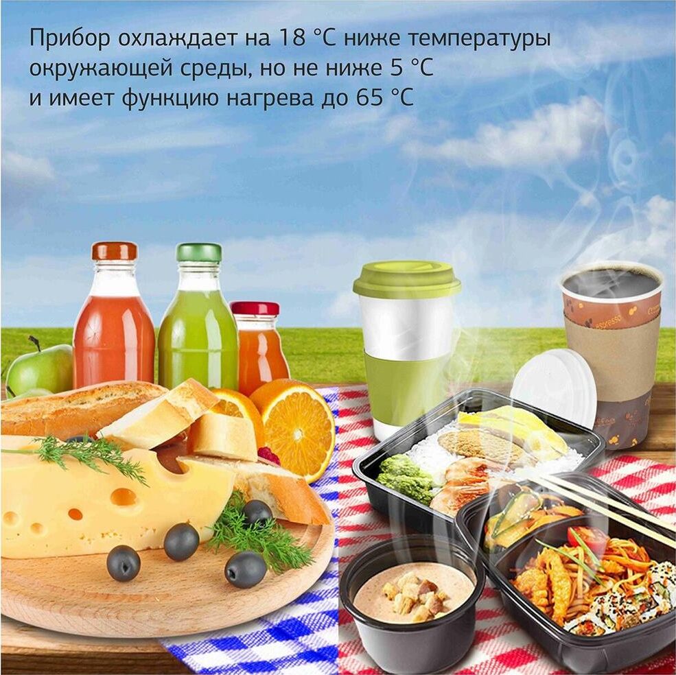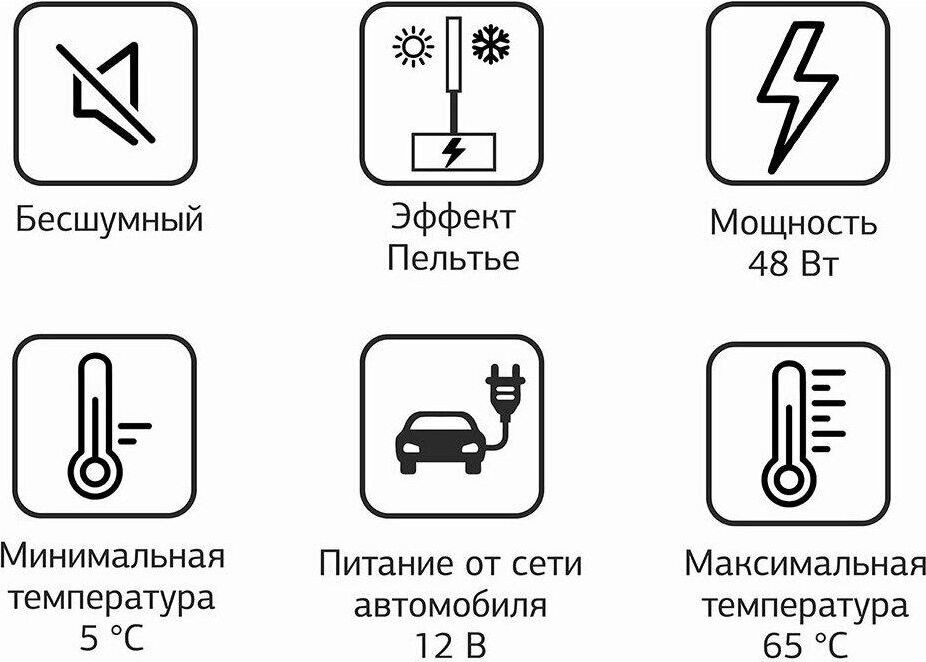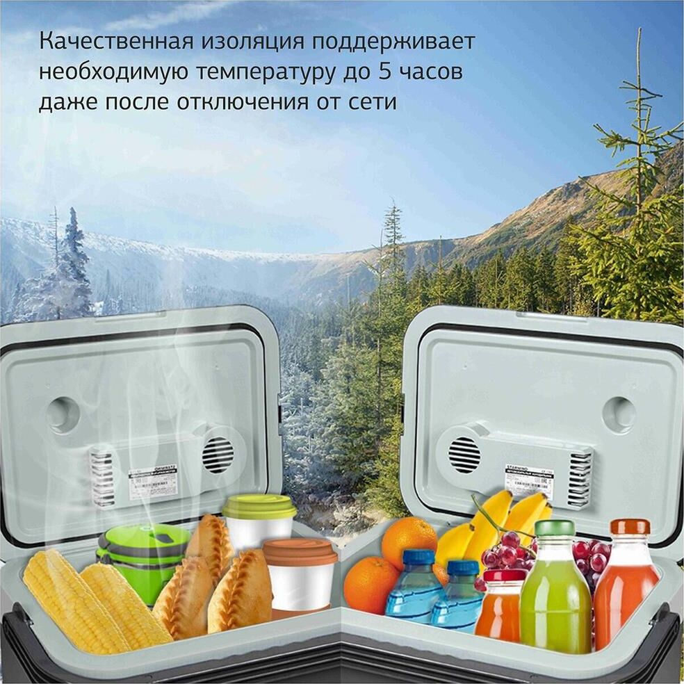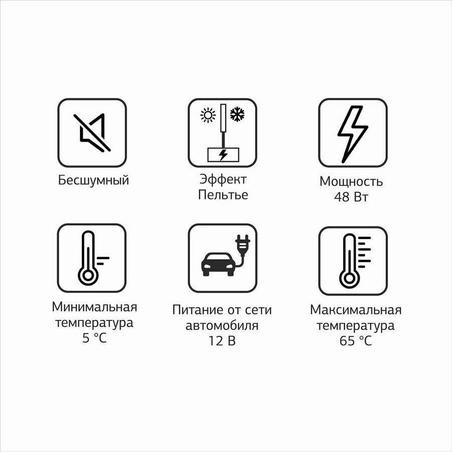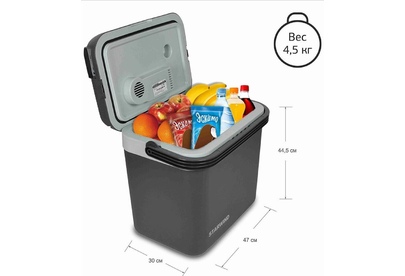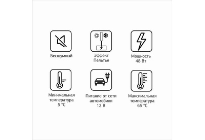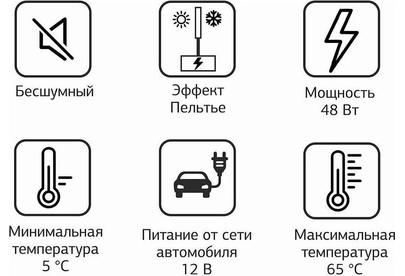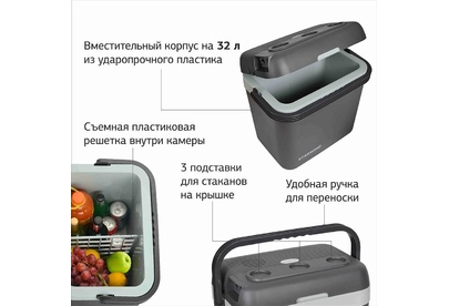 Объем камеры 32 л. Потребляемая мощность 48 Вт. Функция охлаждения. Охлаждение до 5°. Функция нагрева до 65°. Питание от бортовой сети автомобиля 12В. Материал корпуса пластик. Цвет основной серый. Ручка для переноски.