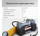 Допустимое напряжение: 10-13,5 В. Максимальный ток потребления: 14 А. Максимальное давление: 10 Атм. (кг/см2). Время непрерывной работы: 30 мин. Производительность: 57 л/мин. Рабочая температура: -40°С +70°С. Масса: 2,7 кг. Навинчивающаяся насадка на ниппель колеса. Подключение в прикуриватель. Спускной клапан – DEFLATOR. Универсальный шланг - удлинитель - 5.5 м. Встроенный плавкий предохранитель - 15A.
