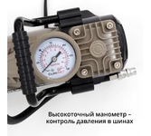 Напряжение: 12 В Макс ток потребления: 9 А Макс давление: 5 Атм. (кг/см2) Время непрерывной работы:16 мин. Производительность: 30 л/мин. Рабочая темп: -40°С +80°С Масса: 1,5 кг поршневого типа система защиты от перегрева Высокоточный двушкальный манометр