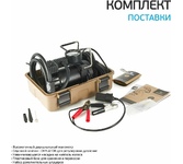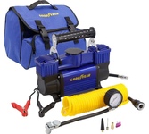 Воздушный компрессор Goodyear GY-80L 80 л/мин, двухпоршневой, питание от АКБ, съемный витой шланг, сумка для хранения Устройство отлично справляется с накачиванием колес джипов, внедорожников, минивэнов, микроавтобусов и небольших грузовиков, а также надувных лодок. В комплект входит набор переходников. Производительный компрессор питается от клемм аккумулятора 12В. Он может беспрерывно работать в течение 30 минут, а с колесом R-16 справляется за 2 минуты. Модель GY-80L оснащена съемным витым шлангом, на конце которого расположен коннектор к ниппелю колеса в виде удобной металлической защелки. За счет этого процесс присоединения компрессора становится практически мгновенным и не требует усилий. Двухпоршневой компрессор поставляется в прочной сумке, что позволяет компактно хранить инструмент в багажнике автомобиля. " Вес: 3,8 кг " Длина провода питания: 3 м " Длина витого шланга: 5 " Габариты ДхШхВ: 290х195х220 мм