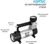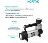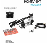 Мощность – 180 Вт. - Максимальная сила тока – 20 А. - Максимальное давление – до 10 кг/см? (150PSI/10Bar) - Производительность – до 75 л/мин. - Шнур питания – 2,7 м. - Воздушный шланг – 5м. - Пластиковый кейс для хранения и переноски - Подключение к клеммам АКБ при помощи металлических зажимов - Комплект насадок-переходников – 3 шт. -Набор дорожного инструмента Цвет- серебро Напряжение питания - 12В. Состав:металл, пластик
