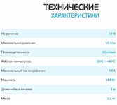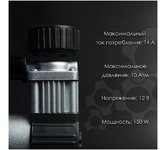 Максимальный ток потребления 15 A. Максимальное давление, атм.10.2. Напряжение питания 12 В. Производительность 35 л/мин. Длина шланга 0.75 м. Длина провода питания 3 м.