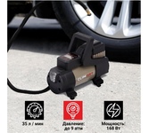 Автомобильный компрессор " Мощность: 168 Вт " Производительность: 35 л / мин " Давление: до 9 Атм " Максимальное токопотребление: 14 А " Питание: 12V " Длина провода питания: 3 м " Длина воздушного шланга: 1 м " Температура эксплуатации: -40… + 60 С° " Защита: плавкий предохранитель " Материал: Сталь " Вес: 1,50 кг " Объем: 0,002 куб.м " Металлическая поршневая группа " Высокоточный цифровой манометр " Функция автоматического отключения по достижению заданного давления " Универсальный автомобильный предохранитель в капсуле " Время непрерывной работы: 30 мин " Сумка-мешок для хранения и переноса компрессора " Переходники в комплекте " Фонарь Питается автокомпрессор от прикуривателя. Автомобильный предохранитель в капсуле защищает устройство и сеть автомобиля от скачков напряжения в случае нештатной работы компрессора.