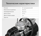 Максимальный ток потребления 15 A. Максимальное давление, атм.10.2. Напряжение питания 12 В. Производительность 35 л/мин. Длина шланга 0.75 м. Длина провода питания 3 м.