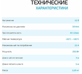 Допустимое напряжение: 10-13,5 В Максимальный ток потребления: 12 А Максимальное давление: 7 Атм. (кг/см2)Время непрерывной работы: 30 мин. Производительность: 30 л/мин. Рабочая температура: -35°С +80°С Масса: 2 кг