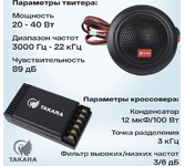 Диаметр динамиков - 16.5 см / 6.5 дюймов Параметры компонентной системы: Частотный диапазон - 50 Гц - 22 кГц Чувствительность - 88 дБ Мощность - 80 - 160 Вт Кроссовер: Конденсатор - 12 мкФ / 100 Вт Точка разделения сигналов на кроссовере - 3 кГц Фильтр для низкочастотного динамика - 3 дБ Фильтр для высокочастотного динамика - 6 дБ Динамик MIDBASS: Частотный диапазон - 50 - 3000 Гц Чувствительность - 88 дБ Мощность - 60 - 120Вт Твитер: Частотный диапазон - 3000 Гц - 22кГц Чувствительность - 89 дБ Мощность - 20 - 40 Вт