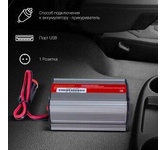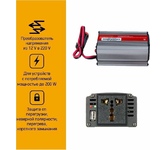 автомобильный преобразователь напряжения, входное напряжение: 11-15 В постоянного тока, выходное напряжение: 230 В переменного тока, выходная мощность БП: 200 Вт, USB