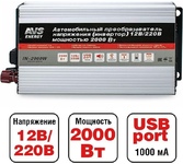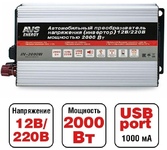 Описание Автомобильный адаптер (инвертер) 12/220V позволяет владельцам автомобилей в дорожных условиях сделать возможной работу бытовой аудио-видео техники, компьютера, ноутбука и прочей оргтехники. Встроенная схема защиты предохраняет устройство от преждевременного выхода из строя в случаях низкого или высокого входного напряжения, неправильной полярности, короткого замыкания во входных цепях питания подключаемого устройства. Характеристики •Входное напряжение: 12В •Выходное напряжение: 220В •Выходная частота: 50Гц •Номинальная мощность: 2000Вт •Допустимая пиковая мощность: 4000Вт •Размеры: 35 х 20 х 7 см •Защита от короткого замыкания •Защита от перегрева Материал: металл, пластик Комплектация Преобразователь Провода