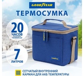 Объем 7 литров Габариты 160 х 180 х 230 мм Вес 0,27 кг Вес нагрузки 2 кг. ОПИСАНИЕ ТЕХНИЧЕСКИЕ ХАРАКТЕРИСТИКИ ПРЕИМУЩЕСТВА Термосумка Goodyear поддерживает определенную температуру внутри и сохраняет свежесть продуктов в течение долгого времени. Это незаменимый помощник при транспортировке продуктов, выездов на пикник и в путешествия, для рыбалки и туризма. Термосумка поддерживает тепло или холод до 20 часов. Она сохранит свежесть и качество охлажденного или замороженного мяса, рыбы, морепродуктов, а также овощей, фруктов, прохладительных напитков и медикаментов. Кроме того, сумка-холодильник идеально подходит для поддержания температуры готовых горячих блюд и детского питания. Внутренний металлизированный слой AlFoil делает отсек для хранения герметичным и защищает сумку от протекания. Материал не впитывает запахи и его просто поддерживать в чистоте. С наружной стороны сумка-холодильник выполнена из плотной износостойкой ткани, которая не промокает и легко моется.