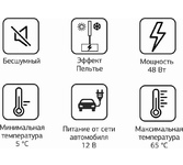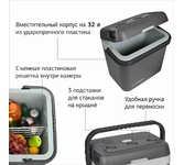 Объем камеры 32 л. Потребляемая мощность 48 Вт. Функция охлаждения. Охлаждение до 5°. Функция нагрева до 65°. Питание от бортовой сети автомобиля 12В. Материал корпуса пластик. Цвет основной серый. Ручка для переноски.