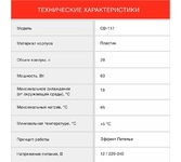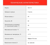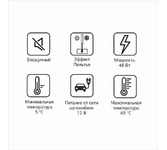 •Питание: 12 В/220 В •Мощность в режиме охлаждения: 48 Вт •Мощность в режиме нагрева: 42 Вт •Емкость: 30 л •Размер упаковки: 475*335*475 мм •Внешний размер (без упаковки): 460*320*460 мм •Размер холодильной камеры: 355*245*395 мм •Вес: 6,25 кг •Работает по принципу эффекта Пельтье •Максимальное охлаждение: 15-18 С от температуры окружающей среды •Минимальная температура: +5 С (при температуре окружающей среды не выше +23 С и непрерывной работе не менее 3-х часов) •Максимальный нагрев: +65 С •Подстаканники на верхней крышке •Ручка и колеса для транспортировки