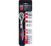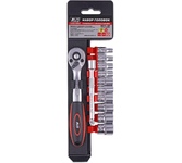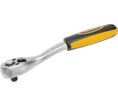 Ключ-трещотка для торцовых головок KRANZ предназначен для закручивания и раскручивания резьбовых соединений. Инструмент обладает высоким рабочим ресурсом. Оснащен цельнометаллическим корпусом с хромированной поверхностью. Изогнутая форма рукоятки создает дополнительное удобство при закручивании и раскручивании соединений, находящихся в труднодоступных местах. Прорезиненная рельефная рукоятка удобно лежит в руке в процессе работ. Инструмент служит для работы с торцевыми головками, которые соединяются при помощи посадочного квадрата 1/4 дюйма с подпружиненным шариковым фиксатором. Длина изделия – 155 мм. Количество зубьев – 72 шт. Материал изготовления – сталь СrV.