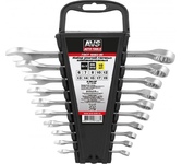 Набор Matrix 15410 включает 9 комбинированных ключей из стали CrV, размером 6-22 мм, с покрытием «матовый хром», которые пригодятся во время ремонтных работ дома или в гараже. С их помощью можно быстро монтировать и демонтировать крепежные элементы. В набор входят инструменты основных типоразмеров, позволяющие эффективно решать поставленные задачи.ПреимуществаВысокая деформационная стойкость — ключи изготовлены из хромованадиевой стали, а рабочие части закалены до твердости 45 HRC.Защита от разрушения — матовое хромоникелевое покрытие предотвращает образование коррозии.Аккуратная работа — накидные части с 12-гранным профилем охватывают всю поверхность крепежа, уменьшая риск деформации его граней.Комфортная работа в ограниченном пространстве — угол наклона кольцевых зевов относительно плоскости инструментов составляет 15°, что делает монтаж крепежа более удобным.Удобный пластиковый держатель — ключи не потеряются во время хранения и транспортировки.