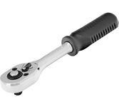 Хромированный ключ-трещотка Сибртех 14000 из стали CrV, с посадочным размером 1/4″ и 45-зубым храповым механизмом, с функцией быстрого сброса, используется для работы с резьбовым крепежом. Трещоточный механизм с 45 зубьями обеспечивает плавное вращение, облегчая работу. Инструмент пригодится дома, в мастерской и гараже. Преимущества Прочность — ключ изготовлен из закаленной хромованадиевой стали и выдерживает высокие нагрузки. Долговечность — зеркальное хромовое покрытие предотвращает образование коррозии. Эргономичность — рукоятка с нескользящей рельефной поверхностью надежно ложится в руку, поэтому работать инструментом комфортно. Функция реверса — при помощи переключателя с металлическим флажком можно одним движением изменить направление вращения трещотки. Надежная фиксация — шариковый замок крепко удерживает торцевую головку, поэтому она не соскочит во время работы. Быстрый сброс — достаточно нажать на кнопку, чтобы освободить головку от насадки, это особенно удобно для работы с крепежом разного размера.