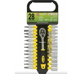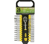 Набор головок универсальных с ключом-трещоткой Калибр НГУ-28-1/4 (артикул 121032) содержит 28 предметов и предназначен для работ в автомастерских и для индивидуального применения. Все инструменты выполнены из хромванадиевой стали со специальным покрытием для защиты от коррозии. В набор входит: Трещотка 1 шт. Головки торцевые 4/4,5/5/5,5/6/7/8/9/10/11/12/13/14мм 13 шт. Биты T10,T15,T20,T25,T30,HEX H3,H4,H5,H6,SL5.5,SL7,PH1,PH2 13 шт. Удлинитель 100 мм 1 шт.