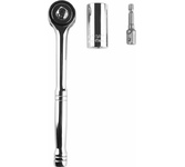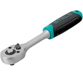 Ключ-трещотка Сибртех 14009 с двухкомпонентной рукояткой и присоединительным квадратом 1/2" используется с торцевыми головками, имеющими посадочное гнездо соответствующего размера. Предназначен для закручивания и раскручивания резьбовых соединений. Храповой механизм с 72 зубцами обеспечивает плавное вращение. Ключ применяется для ремонта автомобилей, техники и оборудования, а также пригодится дома или на даче. Преимущества Прочность и долговечность — инструмент изготовлен из высококачественной хромованадиевой стали. Удобная работа в ограниченном пространстве — шаг трещотки составляет всего 5°. Быстрый переход от монтажа к демонтажу — направление вращения меняется при помощи переключателя. Простая установка и замена насадки — механизм быстрого сброса позволяет моментально снимать торцевую головку. Надежная фиксация оснастки — металлический шарик-держатель не допускает выпадение торцевых головок, адаптеров и удлинителей. Комфортная эксплуатация — эргономичная двухкомпонентная рукоятка удобно ложится в руку.