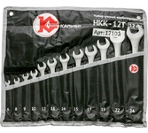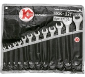 Набор ключей комбинированных Калибр НКК-12Т, арт.121023 состоит из 12 предметов. Каждый ключ изготовлен из высокопрочной CrV стали. Для удобства хранения набор тканевым чехлом. Инструмент сочетает в себе функции накидного и рожкового гаечного ключа. Ключи: 6, 8, 10, 12, 13, 14, 17, 19, 22, 24, 27, 32