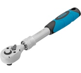 Телескопический хромированный трещоточный ключ Gross 14072, 215-315 мм, из стали CrV, с присоединительным квадратом 3/8 дюйма и 2-компонентной рукояткой, предназначен для монтажных работ с резьбовыми соединениями. Особенно удобен для работы в труднодоступных местах, т.к. имеет запатентованный механизм фиксации телескопической рукоятки. Ее длину можно изменить с 215 до 315 мм. Инструмент используется в слесарных мастерских, автосервисах, пригодится и в быту. Преимущества Высокая износостойкость — ключ-трещотка изготовлен из прочной стали хромованадиевой группы. Долговечность — хромированная поверхность устойчива к ржавчине и воздействию агрессивных веществ. Расширенные возможности — реверсивный механизм позволяет использовать инструмент как для закручивания, так и для откручивания крепежей. Легкая замена оснастки — кнопка быстрого сброса упрощает съем и установку насадок. Высокая плавность работы — храповой механизм с 72 зубцами имеет шаг 5 градусов. Надежная фиксация насадки — благодаря присоединительному ква