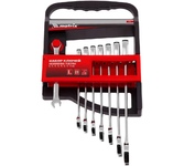 Набор комбинированных гаечных ключей из хромованадиевой стали с 72-зубцовым храповым механизмом в накидной части. Применяется при работе с резьбовыми соединениями. Благодаря наличию трещотки, ключ ускоряет отворачивание и заворачивание крепежа как в обычных условиях, так и в условиях ограниченного пространства. Сатиновое покрытие трещоточного ключа обеспечивает ему дополнительную антикоррозионную стойкость. Размеры ключей – 8, 9, 10, 11, 12, 13, 14, 15, 16, 17, 19 мм Материал – хромованадиевая сталь (CrV) Метод изготовления - холодная штамповка Твердость – 43-49 HRC Соответствует стандарту DIN 3113 Сатиновое покрытие